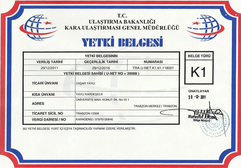 2004 yılında Ulaştırma Bakanlığı'nın Karayolları Taşıma kanununun 4925. maddesine iştirak edip K-1 ve K-3 yetki belgelerine sahip olan ilk firmalar arasındadır